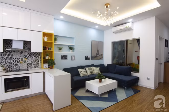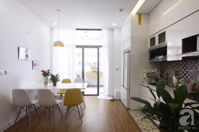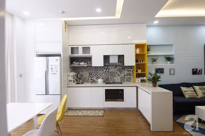 Không gian bếp và khu vực ăn uống có thể nói là khoảng diện tích đẹp nhất của căn hộ khi được kts của Nội Thất Xanh thiết kế với tone màu trắng tinh khôi và nhấn nhá bằng gạch bông ốp bếp kết hợp với màu vàng vô cùng ấn tượng.