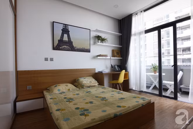 Phòng ngủ với cửa kính trượt trong suốt nhìn ra ban công rộng thoáng và tràn ngập ánh sáng.
