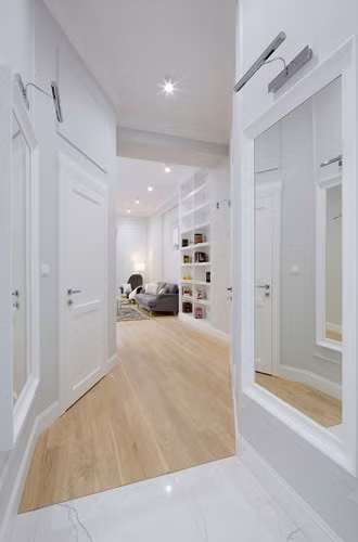 Lối vào với sàn gỗ và tường trắng.
