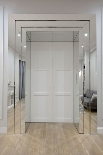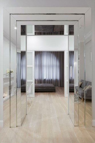 Lối vào phòng ngủ ấn tượng với tường bằng gương, tạo sự rộng rãi cho không gian.