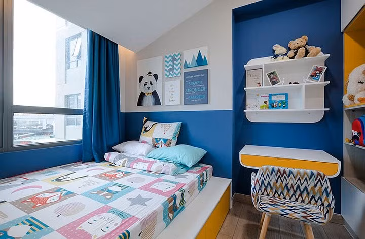 Bàn ở đầu giường vừa là bàn học của bé vừa là bàn trang điểm của mẹ.