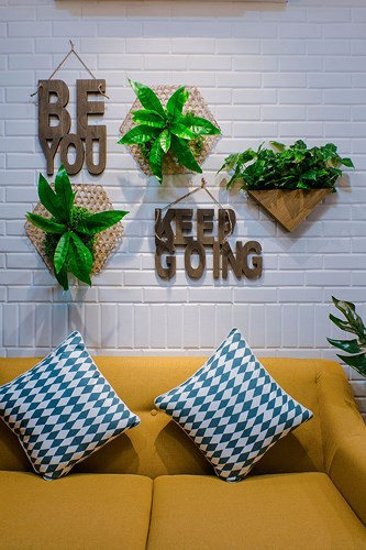 Tiêu biểu là ghế sofa màu vàng nằm nổi bật dưới bức tường trắng có những chậu cây treo tường độc đáo.