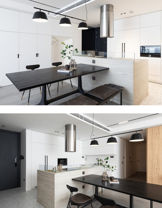 | Nội thất tinh giản cả về màu sắc lẫn chi tiết. Căn hộ sử dụng bốn màu chính gồm trắng, xám, đen và nâu sáng. Màu trắng, xám, đen đem tới cảm giác sạch sẽ, hiện đại còn màu nâu sáng tăng phần ấm cúng, yếu tố cần thiết đối với nơi ở của một gia đình. |