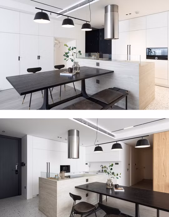 | Hệ tủ cao chạm trần cho phép chủ nhà giấu hết đồ đạc, kể cả tủ lạnh. Cũng nhờ các hệ tủ và cách bố trí nội thất mà gia chủ có thói quen sống gọn gàng hơn. |
