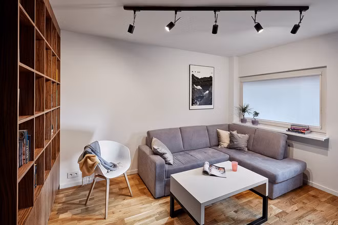 Sử dụng sofa xám nhạt, bàn trà màu trắng cũng khiến phòng khách trông rộng rãi hơn.