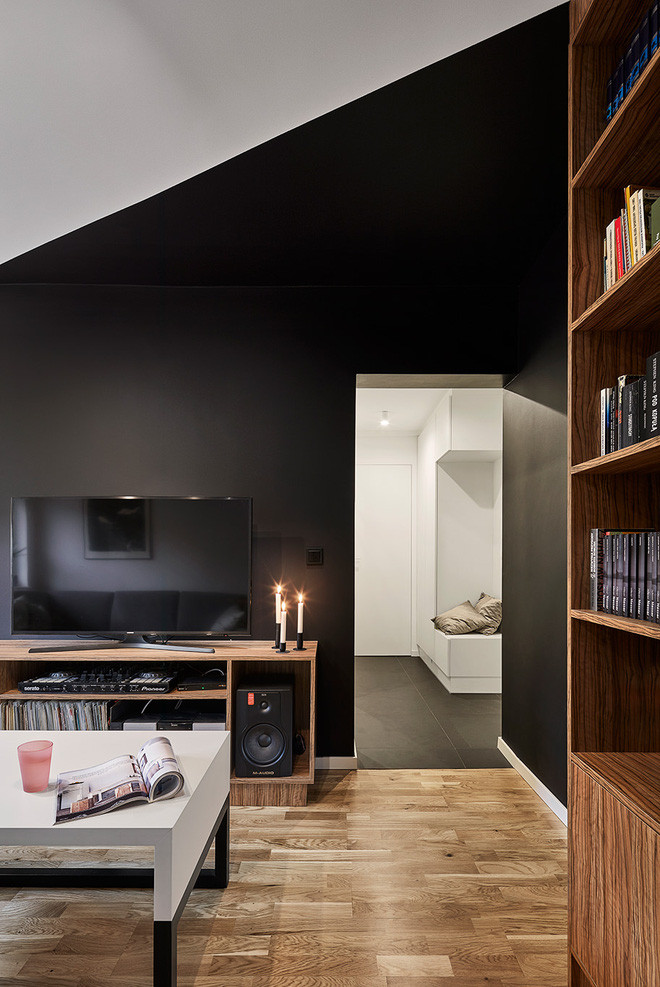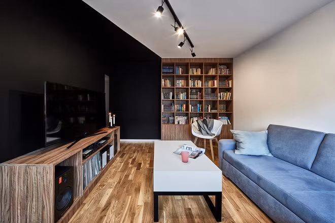 Phòng khách là không gian tiếp nối ngay hành lang ra vào với bức tường chính được sơn màu đen ấn tượng.