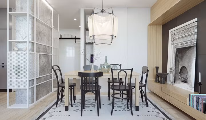 Bộ bàn ăn 6 ghế được đóng khung trên một tấm thảm bằng len ấm áp.