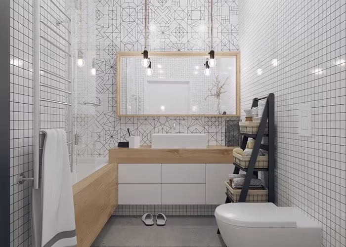 Phòng tắm là sự kết hợp hoàn hảo của tất cả các không gian. Bức tường gạch sọc đen trắng của phòng ăn, tông màu gỗ tạo thành tấm bao quanh bồn tắm lấy ý tưởng từ thiết kế nhà bếp, đèn treo thả từ trần xuống bắt nguồn từ ý tưởng tiết kiệm không gian thông minh.