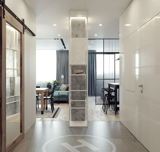 Bức tường ở lối vào chia căn hộ thành hai khu vực riêng biệt, một bên dùng để tiếp khách, bên còn lại là nơi nghỉ ngơi của chủ nhà.