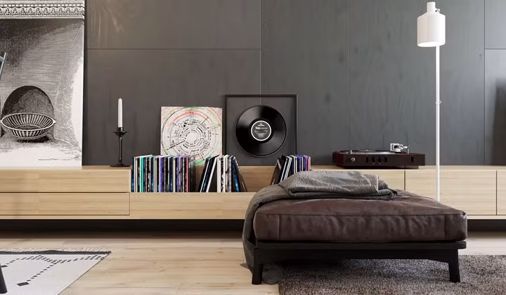 Kệ ti vi kê sát tường đồng thời cũng là giá sách.