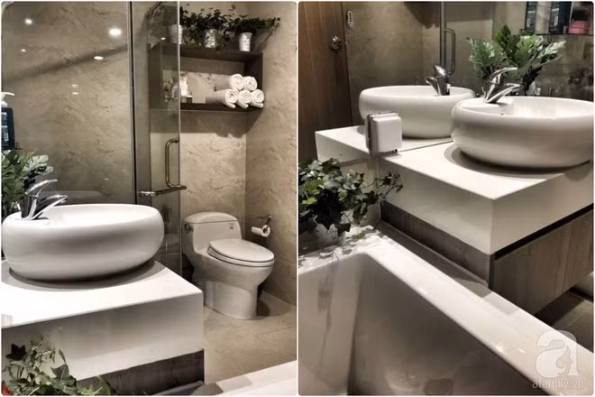 Phòng vệ sinh với diện tích khá nhỏ nhắn nhưng vẫn đủ tinh tế và hiện đại nhờ lựa chọn nội thất với đường cong duyên dáng.