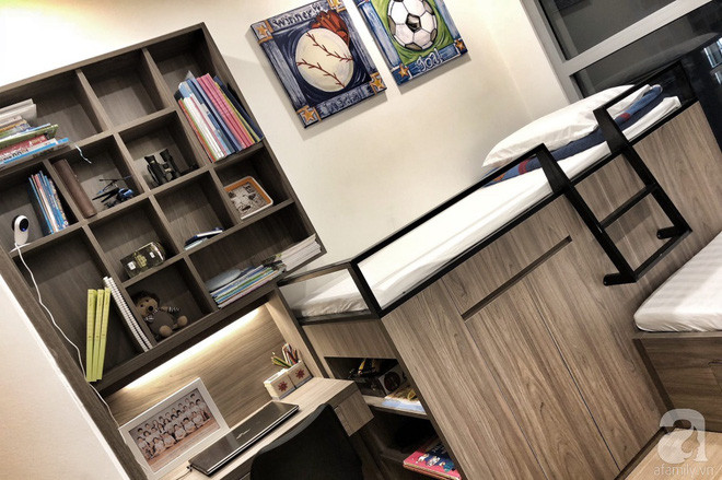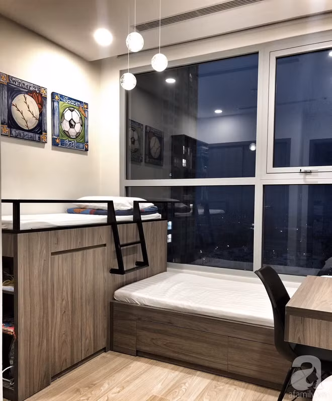 Phòng ngủ của hai bé được thiết kế giường tầng sáng tạo.
