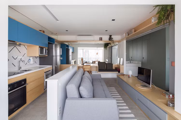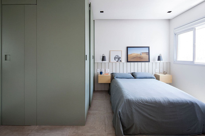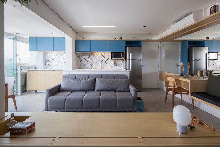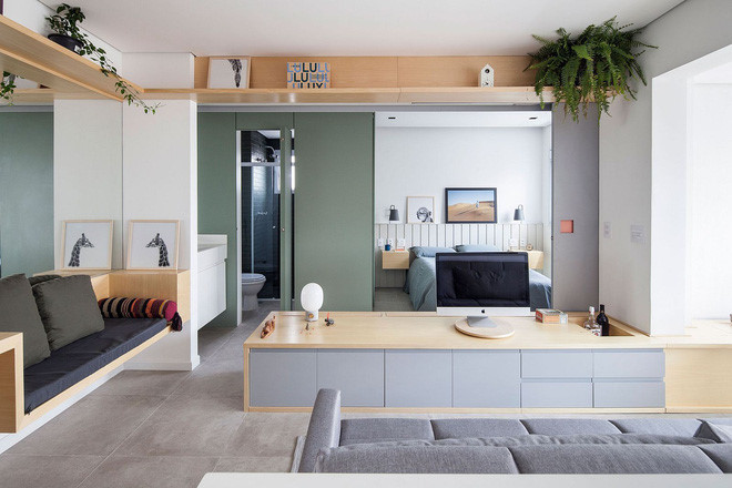 Bất lợi về diện tích song bằng cách sử dụng hệ thống cửa trượt, tủ lưu trữ dạng ẩn gắn trên tường, căn hộ vẻn vẹn 38m2 tại Brazil vẫn khiến khách ghé thăm phải trầm trồ vì sự thoáng rộng và tiện nghi.