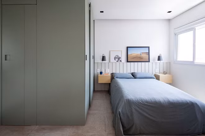 Phòng ngủ nhỏ tận dụng tối đa khu vực đầu giường để trang trí.