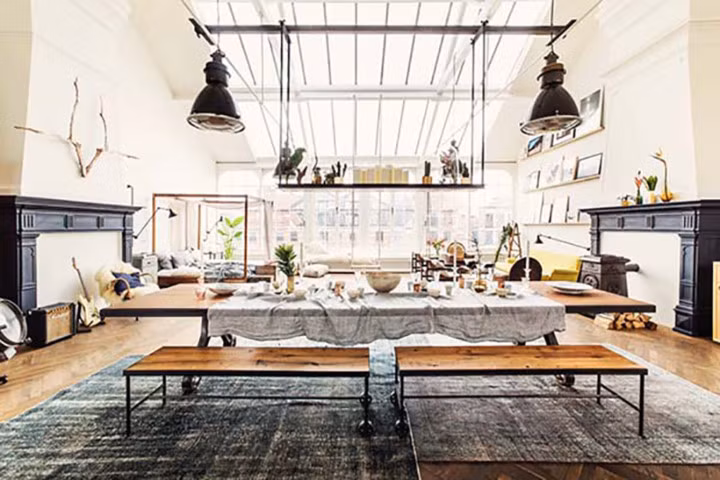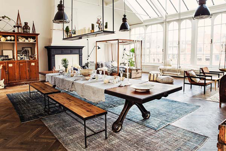 Khu vực ăn uống là bộ bàn ghế công nghiệp lớn, đặt trên những tấm thảm trang trí.