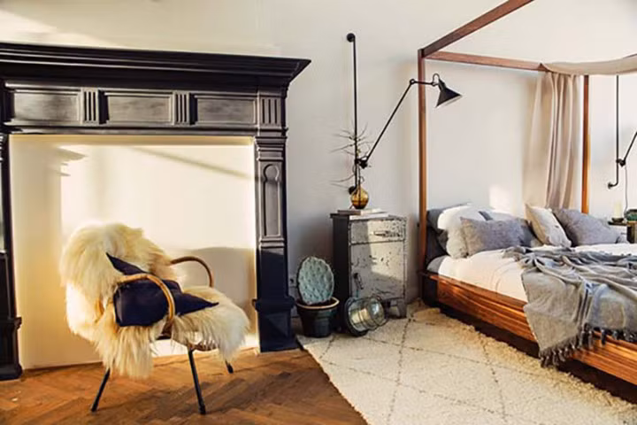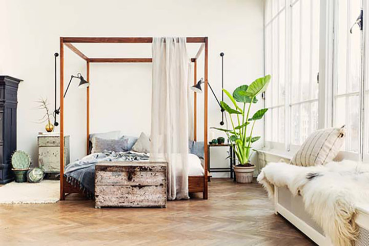 Một chiếc giường canopy tuyệt đẹp kết hợp hoàn hảo với trần nhà cao.