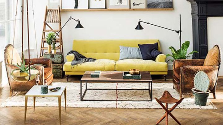 Một chiếc ghế sofa được đặt trong phòng khách tạo ra hiệu ứng màu sắc đặc biệt.