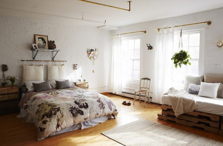 Ghế sofa được chế tạo từ các pallet gỗ xếp chồng lên nhau, không thể phù hợp hơn với phong cách thiết kế của không gian này.