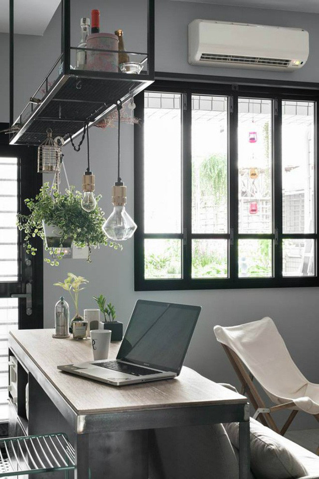 Những chậu cây nhỏ xinh được treo lên giá để không gian thêm thân thiện, gần gũi với thiên nhiên.