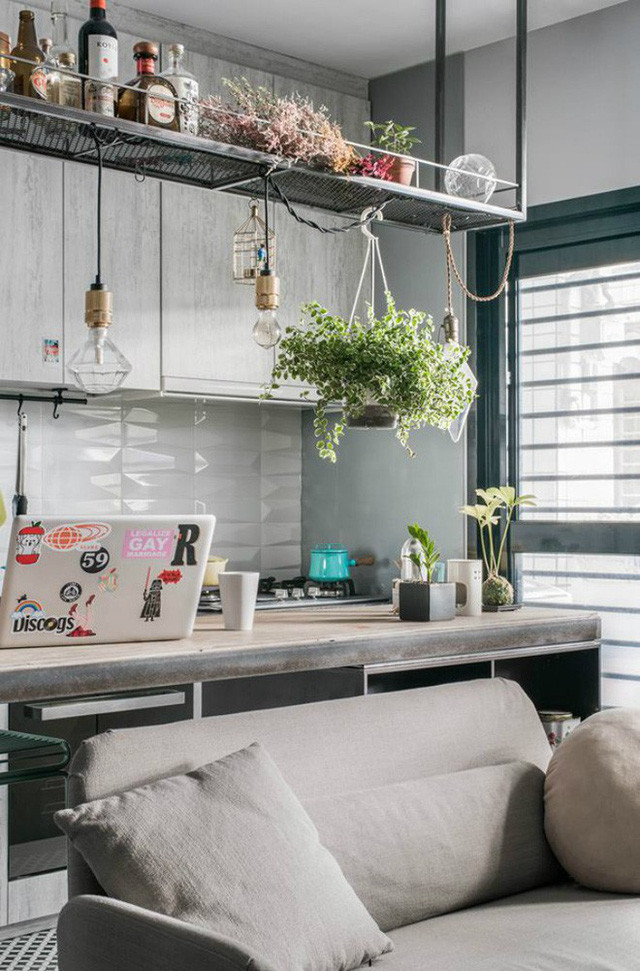 Giá treo vừa được sử dụng để cất trữ gia vị, đồ dùng thường xuyên sử dụng trong bếp, vừa là nơi để gắn những bóng đèn thả xuống bàn ăn mang không gian ấm cúng cho không gian.