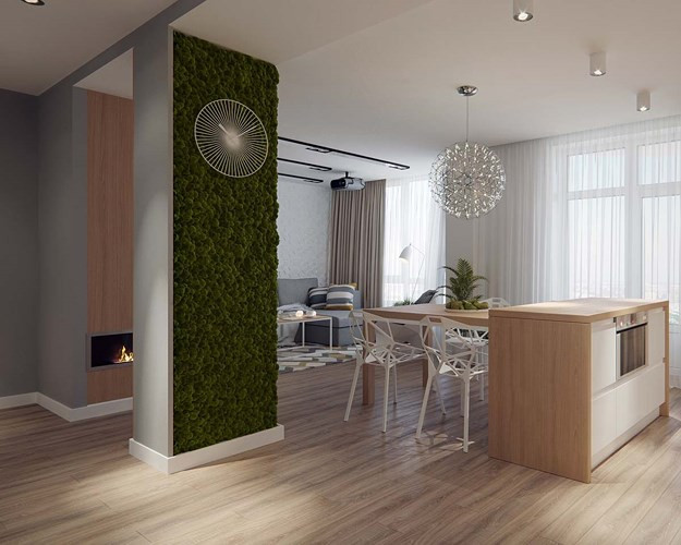Bức tường cây trả lại bầu không khí vui tươi, sang trọng trong căn hộ sử dụng nhiều tông màu trung tính.