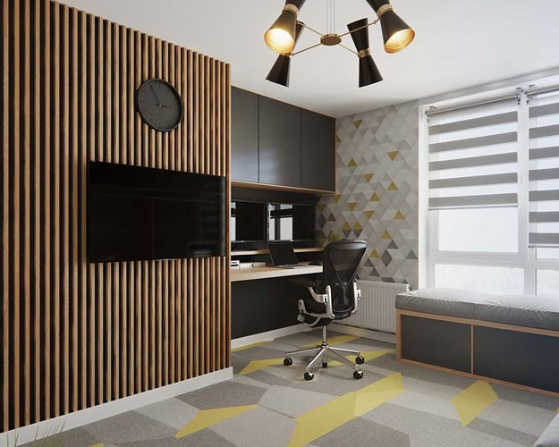 Phòng làm việc tại nhà tiếp nối chủ đề của khu vực phòng khách.