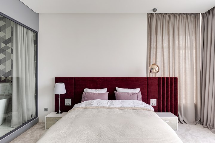 Tấm đầu giường bọc bằng vải nhung màu đỏ tạo thế cân bằng với cách trang trí phòng ngủ bằng các gam màu trung tính.