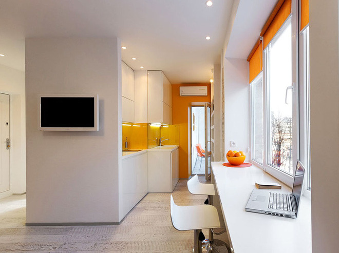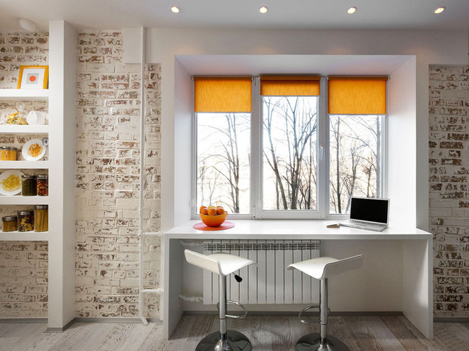 Tận dụng khung cửa sổ để thiết kế bàn dài, thêm ghế xoay cao để tiện lợi cho chức năng ăn uống và làm việc.