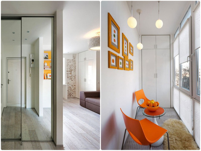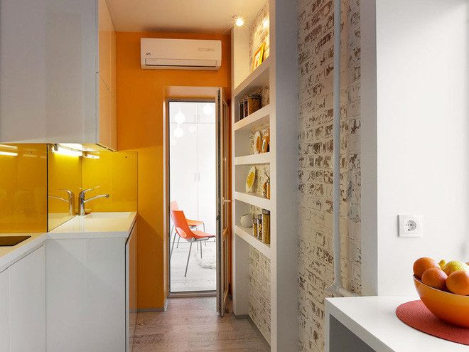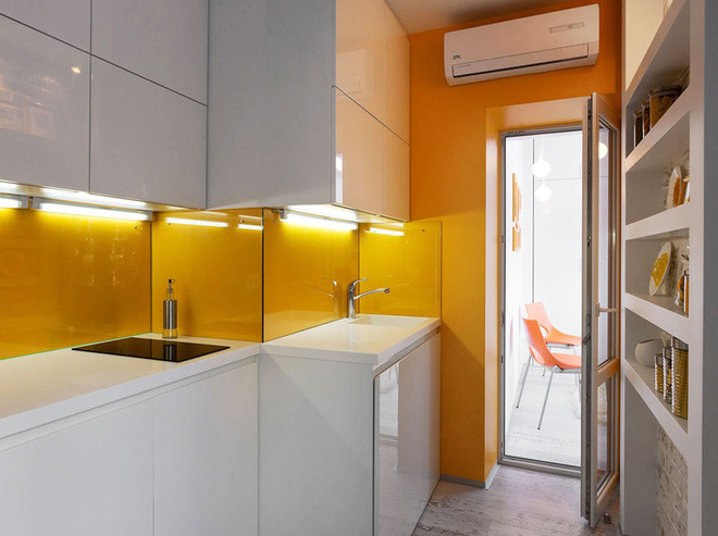 Góc nhỏ bên trong vừa là nơi bố trí khu vực nấu nướng vừa tận dụng khoảng tường đối diện để đóng thêm kệ đựng đồ. Sự hài hòa nhịp nhàng giữa màu trắng của nội thất với màu cam vàng của tường, thêm ánh sáng của đèn và ánh sáng tự nhiên để khu vực nấu nướng dù nhỏ vẫn đẹp xinh bất ngờ.