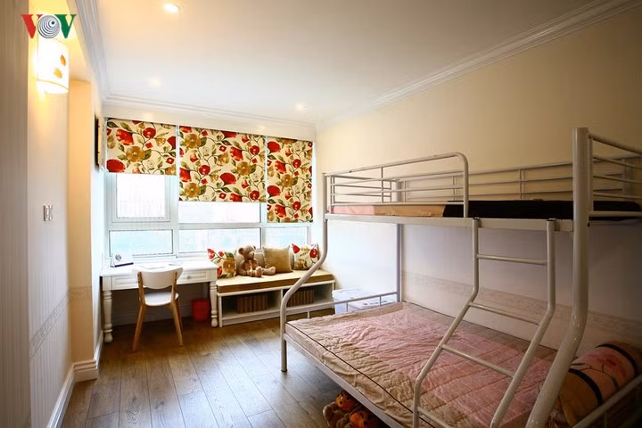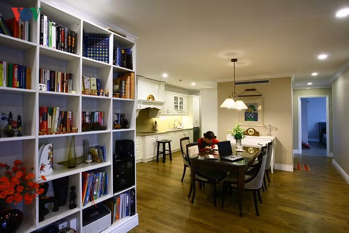 Mặt bằng của căn hộ được bố trí lại cho phù hợp với nhu cầu sử dụng của gia đình. Khu vực học hành/làm việc được dỡ bỏ để mở rộng hai phòng ngủ cho các con. Bếp và phòng ăn liền mạch, không bị ngăn cách.