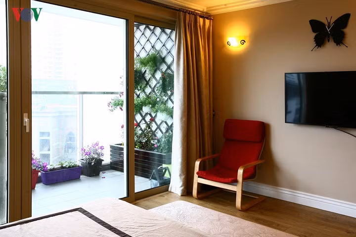 Kế bên phòng ngủ là một logia rộng, giúp căn phòng tràn ngập ánh sáng tự nhiên với khoảng xanh nho nhỏ.
