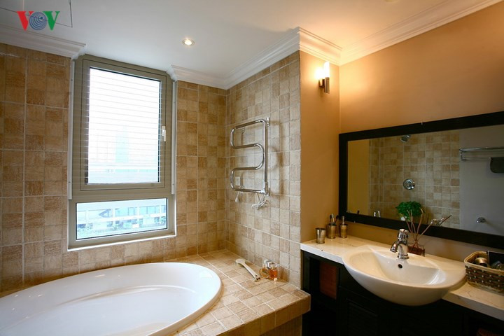 Phòng vệ sinh master thay đổi so với thiết kế ban đầu. Màu sắc và chất liệu vừa hiện đại vừa cổ điển.