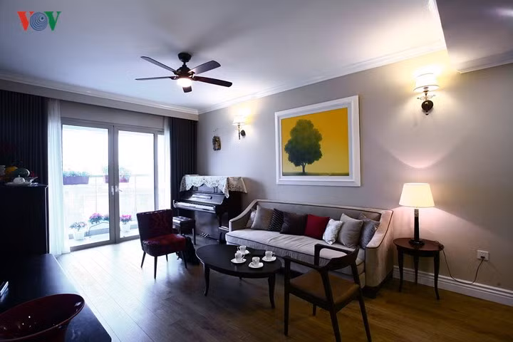Kiến trúc sư đã sử dụng tối giản về màu sắc với sơn tường màu trung tính, mảng trần trắng sáng, đồ nội thất gỗ màu trầm. Không gian phòng khách sang trọng với đàn piano cùng bàn ghế đơn giản màu gỗ nâu hoặc xám, có thể nhìn ra ban công tràn ngập hoa lá. Chiếu sáng nhân tạo được nghiên cứu rất kỹ để làm nổi bật sự duyên dáng và tinh tế của không gian và đồ đạc nội thất.