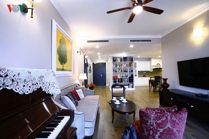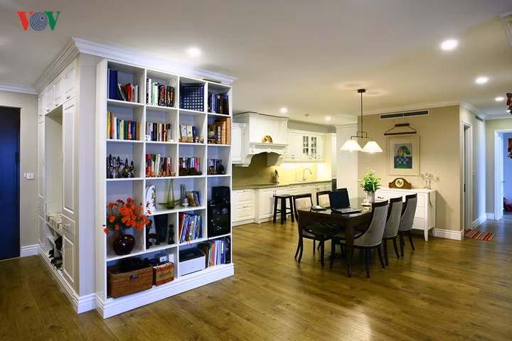 Không gian phòng sinh hoạt chung kéo dài suốt từ logia tới khu vực sảnh và bếp với kệ sách là khu vực chuyển tiếp. Kệ sách như một điểm nhấn ở khu vực sảnh. Căn hộ được thiết kế với phong cách châu Âu truyền thống với gam màu trung tính; sử dụng rất tiết chế, chọn lọc những chi tiết trang trí.