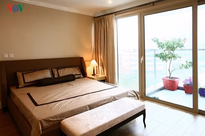 Phòng ngủ chính bố trí đơn giản, với đồ nội thất đồng bộ phong cách chung của cả nhà.