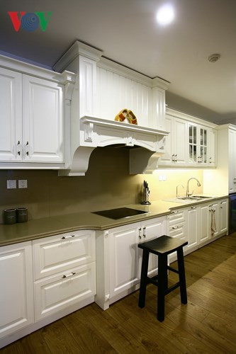 Hệ thống tủ bếp với những chi tiết cổ điển, nhưng được sơn màu trắng gợi cảm giác nhẹ nhàng, lãng mạn.