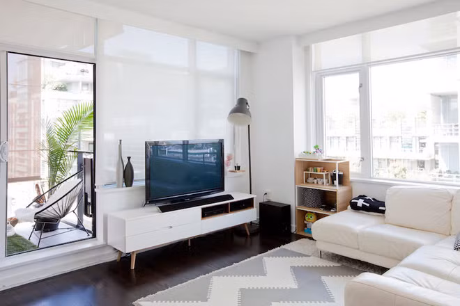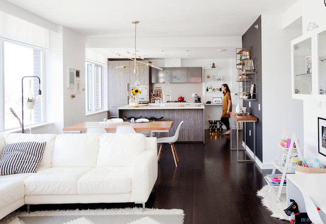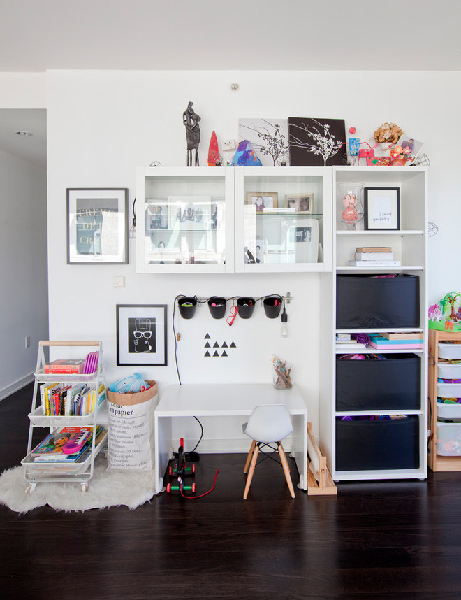 Đầu tiên, chủ nhân của căn hộ lưu tâm đến việc tổ chức không gian lưu trữ. Ví dụ căn hộ có nhiều góc được thiết kế tủ đựng đồ nhiều ngăn để phân loại các hộp đồ chơi, thiết kế các tủ, kệ đựng đồ để mọi vật dụng được sắp xếp gọn gàng, ngăn nắp.