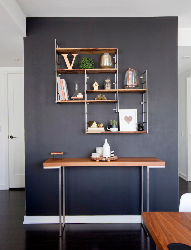 Một bức tường nhỏ được sơn với gam màu tối, là nơi để chủ nhân của căn hộ nhỏ bố trí kệ kim loại với các ngăn bằng gỗ tiện ích, giúp việc bố trí đồ làm đẹp không gian một cách dễ dàng và hiệu quả.