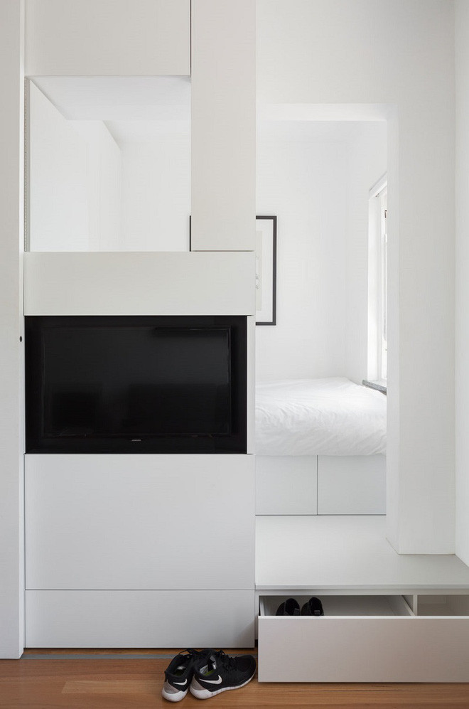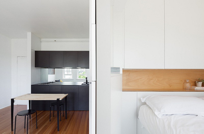Bên phải chính là phòng ngủ đơn giản lấy tông màu trắng làm chủ đạo, để ăn gian diện tích và giúp cái nhìn rộng rãi hơn.