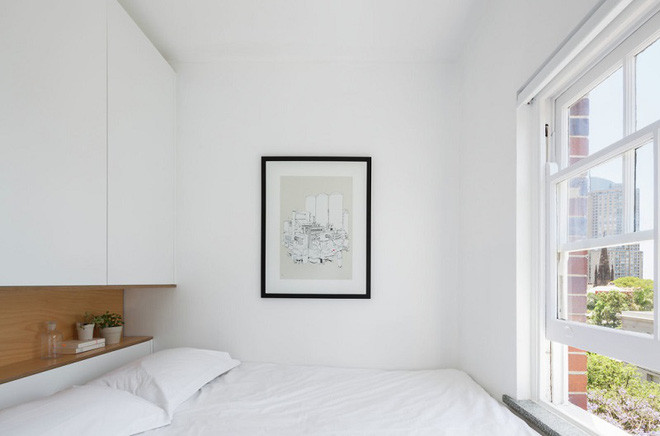 Mọi đồ vât trang trí chỉ là vừa đủ, như bức tranh treo tường, chậu cây cảnh nhỏ. Một cửa sổ lớn đối diện trực tiếp với giường ngủ mang ánh sáng và không khí tươi mới cho không gian.