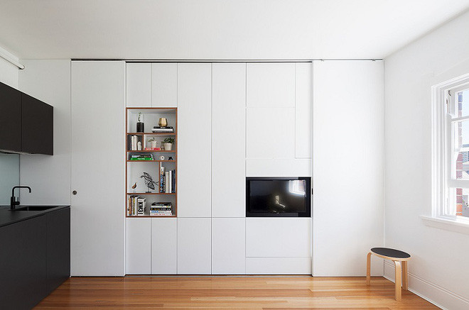 Bức tường là nơi lưu trữ các chức năng phụ như tivi, kệ sách, gương …