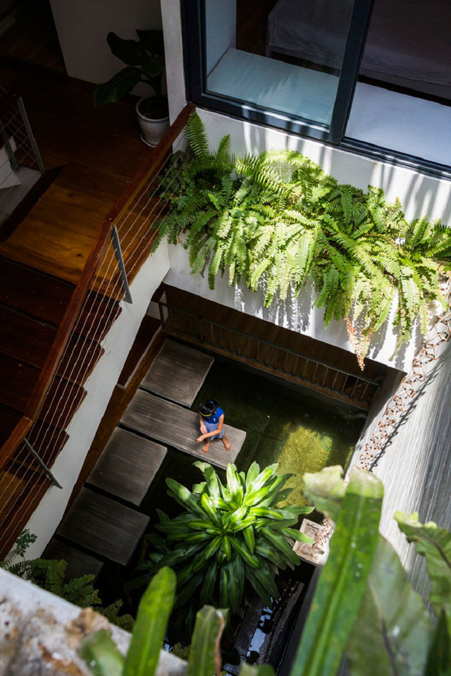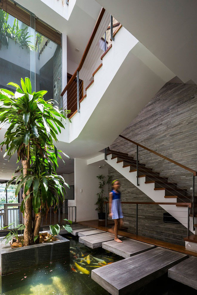 Một hồ cá Koi được đặt giữa nhà, gần khu vực cầu thang vừa lấy sáng được từ giếng trời, vừa làm mát nhà và khiến không gian trở nên sinh động.