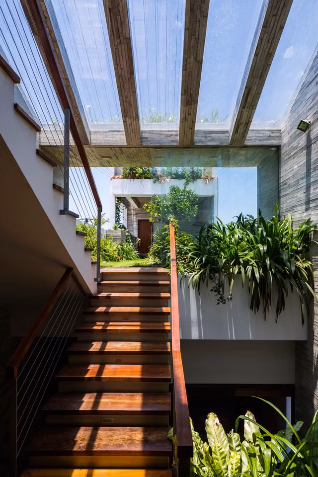 Cùng với công viên mini, để giải quyết yếu tố thông gió và ánh sáng cho ngôi nhà, các KTS đã tạo ra những khu vườn xanh ở trung tâm, đảm bảo được 5 yếu tố: Kim, Mộc,Thủy, Hỏa, Thổ cùng hòa hợp với nhau, tạo ra không khí mát mẻ, giúp con người gần gũi với thiên nhiên hơn.