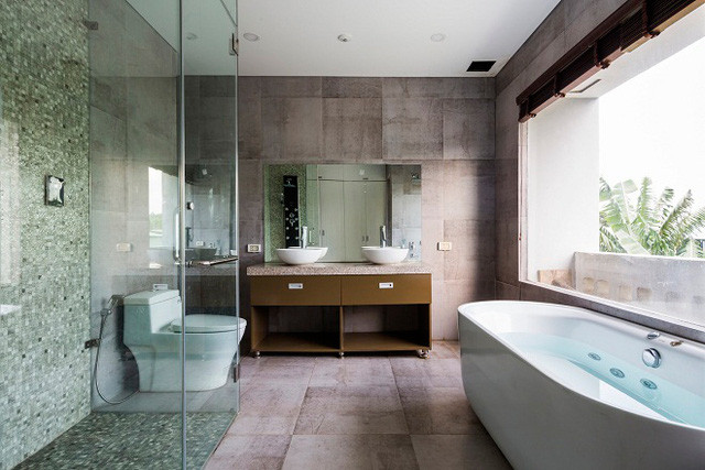 Phòng tắm sang trọng như khách sạn 5 sao, có cửa kính bắt sáng, nhìn ra cảnh đẹp bên ngoài rất thơ mộng.