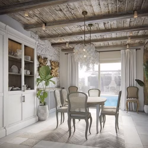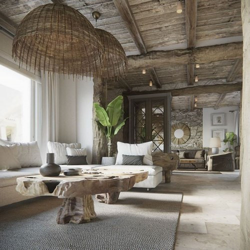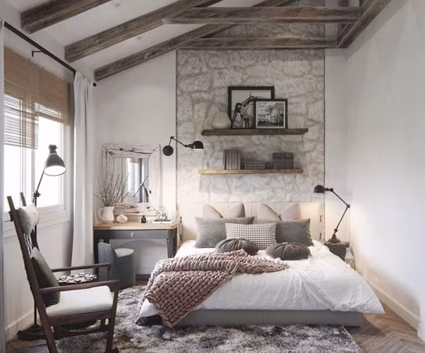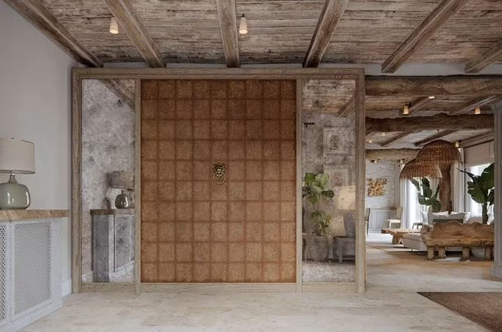 Sự mộc mạc, bình dị trong thiết kế này chính bởi những vật liệu xây dựng, mái lợp ngói, đồ nội thất bằng gỗ thô nguyên khối, đèn cổ.