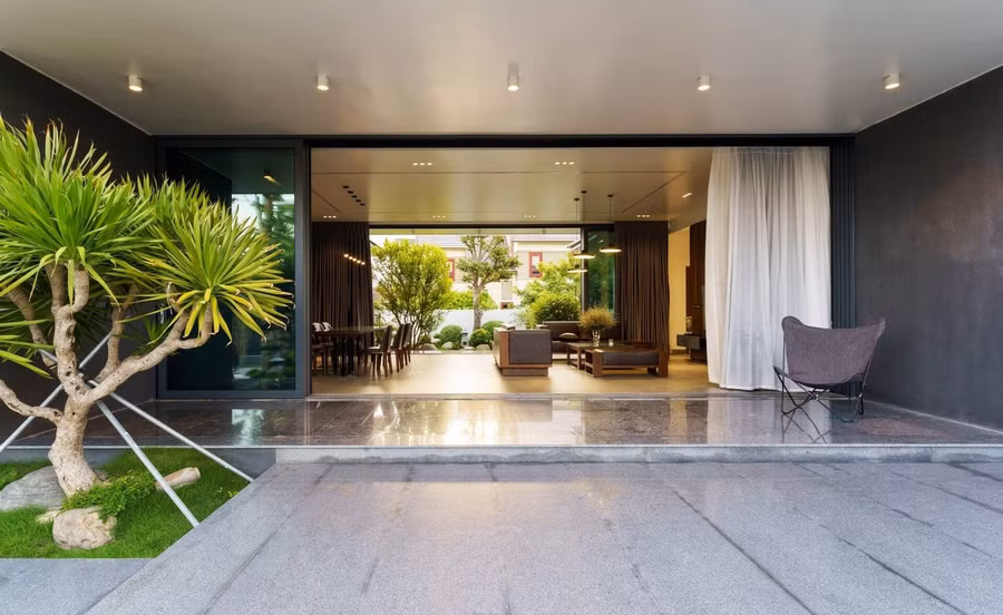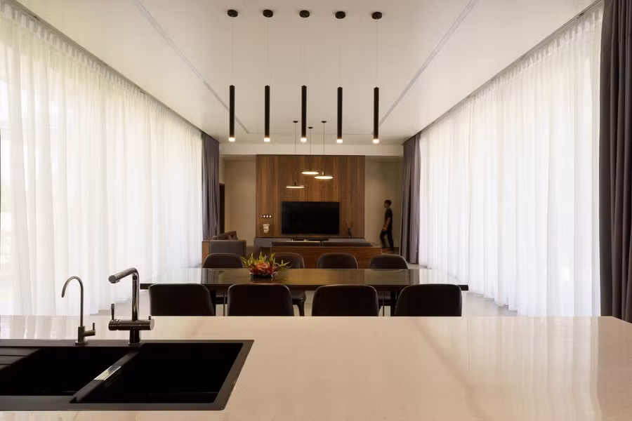 Bên trong, Q House được thiết kế theo triết lý “mở nhưng vẫn riêng” vừa gắn kết, vừa tôn trọng cá tính của từng thành viên. Không gian sinh hoạt chung được mở rộng tối đa với hệ cửa sát trần, giúp ánh sáng tràn ngập và kết nối liền mạch sân trước và sân sau. Nội thất hiện đại tông trầm kết hợp ánh đèn vàng tạo cảm giác ấm áp, gần gũi. Dù ở phòng khách, bếp hay bàn ăn, các thành viên đều có thể nhìn thấy nhau, trò chuyện cùng nhau.