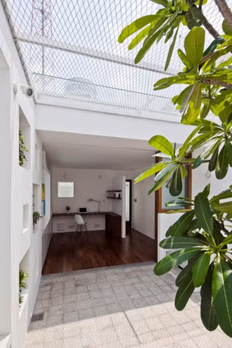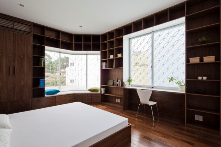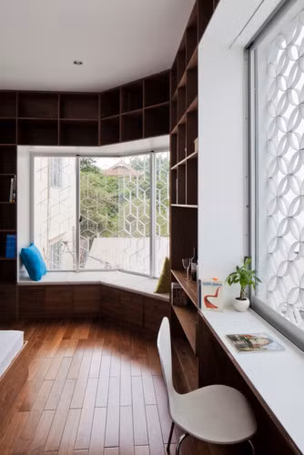 Một căn nhà có thiết kế nổi bật với nhiều cửa sổ lớn tạo cho người xem cảm giác như chiếc lồng chim khổng lồ giữa con hẻm nhỏ tại TP.HCM.