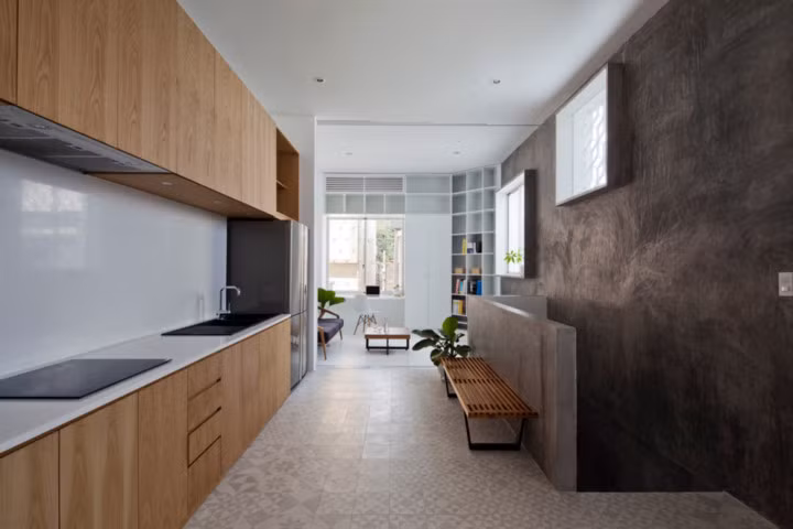 Phòng bếp và phòng khách được đặt tại tầng hai của căn nhà. Bếp và phòng khách được chia tách bằng màu nội thất.