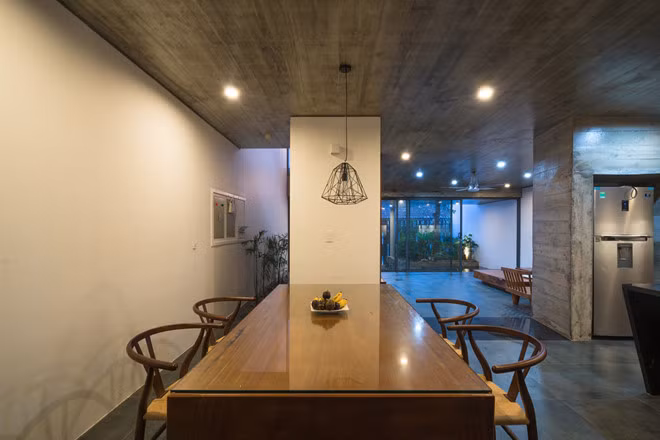 Bàn ăn chính rộng rãi cho bốn người trong gia đình hai thế hệ.