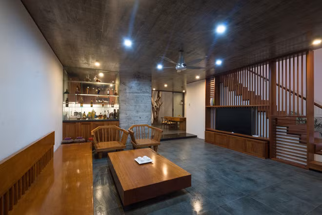 Phòng khách sử dụng nhiều nội thất gỗ, giúp làm ấm không gian sử dụng nhiều màu xám.